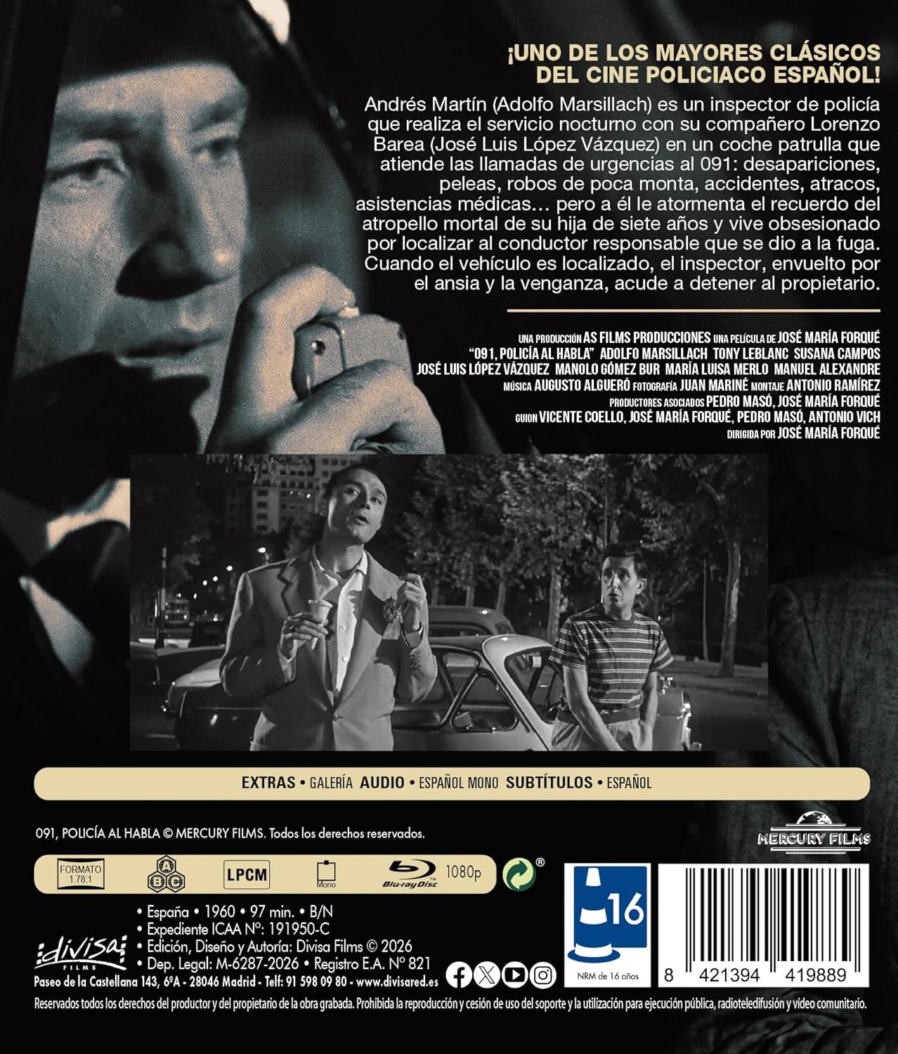 https://back.dvdstorespain.es/es/preventa/131591-091-policia-al-habla-1960-jose-maria-forque-blu-ray-blu-ray-2026--8421394419889.html131591091, Policía al Habla [Blu-ray] (1960)Andrés Martín (Adolfo Marsillach) es un inspector de policía que hace el servicio nocturno desde un coche patrulla que atiende las llamadas de urgencia al 091. En una noche de patrulla atienden todo tipo de asuntos: desapariciones, peleas, ladrones de poca monta, accidentes, atracos, urgencias... pero a él una idea le obsesiona continuamente: localizar al coche y al conductor responsables de la muerte de su hija, atropellada por un coche negro que se dio a la fuga.https://dvdstorespain.es/1166963-home_default/091-policia-al-habla-1960-jose-maria-forque-blu-ray-blu-ray-2026-.jpg14.4628instock14.462814.4628002026-04-02T03:45:13+0200/Inicio/Inicio/Blu-ray/Inicio/Películas/Inicio/Preventa