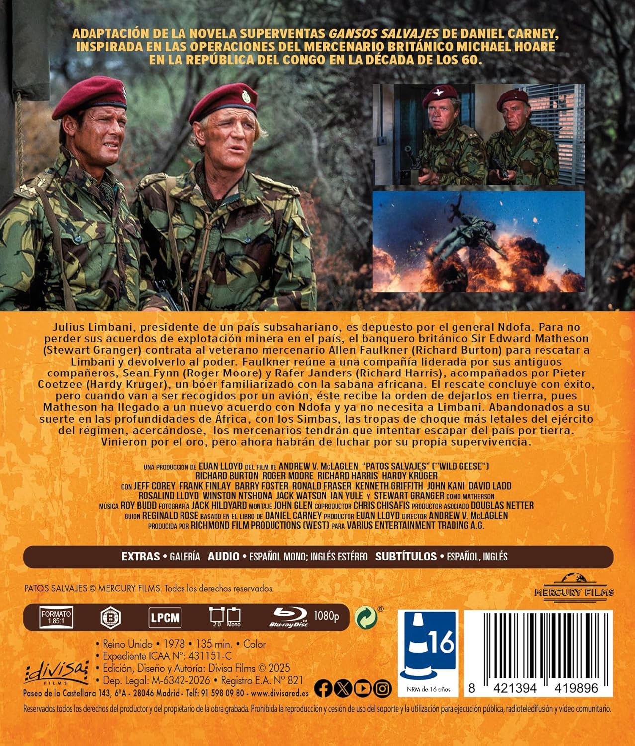 https://back.dvdstorespain.es/es/preventa/131592-patos-salvajes-the-wild-geese-1978-andrew-v-mclaglen-blu-ray-blu-ray-2026--8421394419896.html131592Patos Salvajes [Blu-ray] (1978) The Wild GeesePelícula de acción con un argumento muy similar al de "Los profesionales", pero ambientada en África. Granger es un hombre de negocios británico que contrata a Burton y sus mercenarios (Moore, Harris) para realizar una peligrosa misión en Rhodesia: liberar a un líder del movimiento liberal negro liberal que está en poder de un dictador. https://dvdstorespain.es/1166965-home_default/patos-salvajes-the-wild-geese-1978-andrew-v-mclaglen-blu-ray-blu-ray-2026-.jpg14.4628instock14.462814.4628002026-04-02T03:45:22+0200/Inicio/Inicio/Blu-ray/Inicio/Películas/Inicio/Preventa