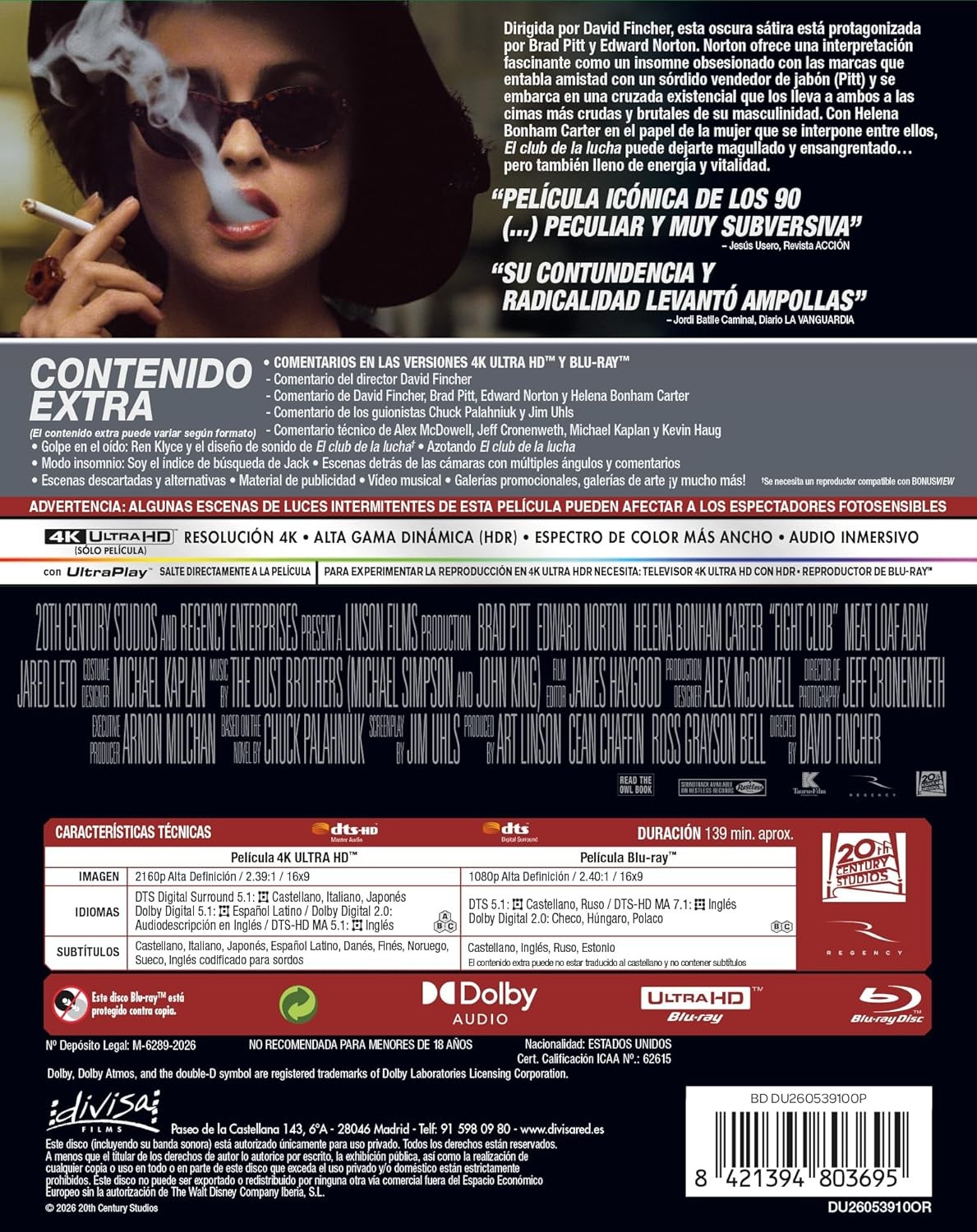 https://back.dvdstorespain.es/es/preventa/131602-el-club-de-la-lucha-fight-club-1999-david-fincher-4k-uhd-blu-ray-blu-ray-2026--8421394803695.html131602El Club de la Lucha [4K UHD, Blu-ray] (1999) Fight ClubUn joven hastiado de su gris y monótona vida lucha contra el insomnio. En un viaje en avión conoce a un carismático vendedor de jabón que sostiene una teoría muy particular: el perfeccionismo es cosa de gentes débiles; sólo la autodestrucción hace que la vida merezca la pena. Ambos deciden entonces fundar un club secreto de lucha, donde poder descargar sus frustaciones y su ira, que tendrá un éxito arrollador.https://dvdstorespain.es/1170046-home_default/el-club-de-la-lucha-fight-club-1999-david-fincher-4k-uhd-blu-ray-blu-ray-2026-.jpg21.4876instock21.487621.4876002026-04-02T04:16:26+0200/Inicio/Inicio/Películas/Inicio/4K-UHD/Inicio/Preventa