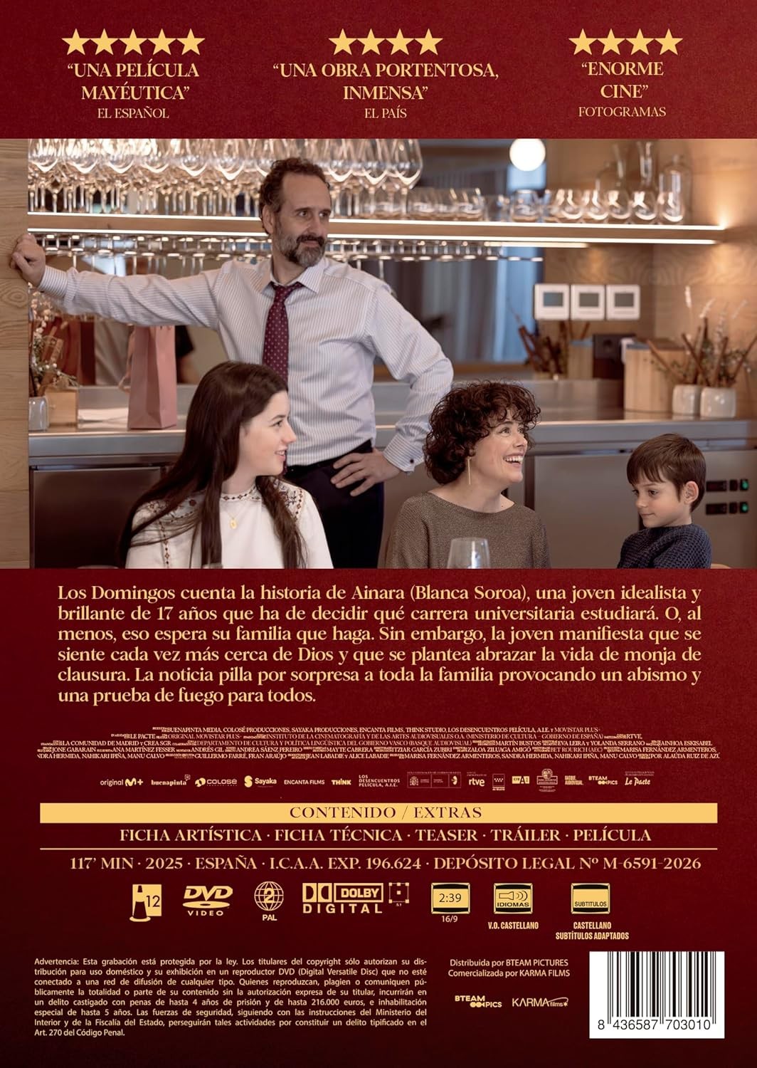 https://back.dvdstorespain.es/es/preventa/131684-los-domingos-dvd-2026--8436587703010.html131684Los Domingos [DVD] (2025)<p>Ainara (Blanca Soroa), una joven idealista y brillante de 17 años, ha de decidir qué carrera universitaria estudiará. O, al menos, eso espera su familia que haga. Sin embargo, la chica manifiesta que se siente cada vez más cerca de Dios y que se plantea abrazar la vida de monja de clausura. La noticia pilla por sorpresa a toda la familia, provocando un abismo y una prueba de fuego para todos.</p>https://dvdstorespain.es/1168538-home_default/los-domingos-dvd-2026-.jpg12.3141instock12.314112.3141002026-04-07T20:30:02+0200/Inicio/Inicio/DVD/Inicio/Películas/Inicio/Preventa