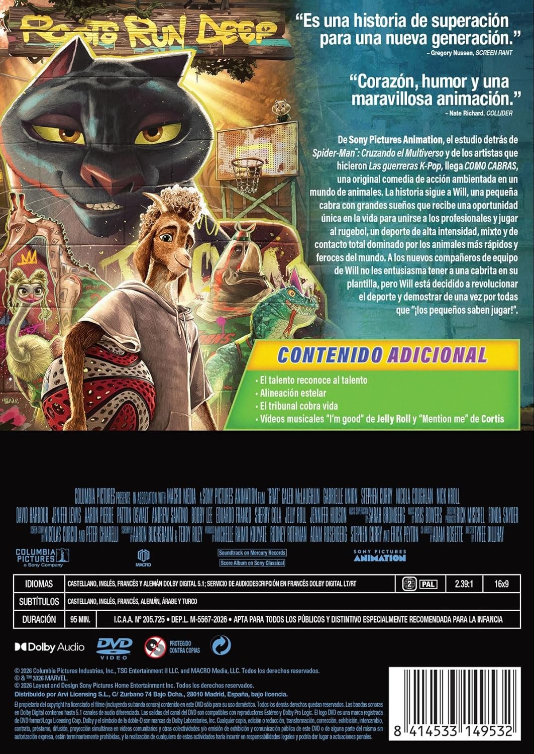 https://back.dvdstorespain.es/es/preventa/132152-goat-como-cabras-dvd-2026-goat-8414533149532.html132152GOAT: Como Cabras [DVD] (2026) GOATWill es una pequeña cabra con grandes sueños que recibe una oportunidad única en la vida para unirse a los profesionales y jugar al rugebol, un deporte de alta intensidad, mixto y de contacto total dominado por los animales más rápidos y feroces del mundo. A los nuevos compañeros de equipo de Will no les entusiasma tener a una cabrita en su plantilla, pero Will está decidido a revolucionar el deporte y demostrar de una vez por todas que '¡los pequeños saben jugar!'.https://dvdstorespain.es/1177755-home_default/goat-como-cabras-dvd-2026-goat.jpg17.7686instock17.768617.7686002026-04-23T00:47:07+0200/Inicio/Inicio/DVD/Inicio/Películas/Inicio/Preventa