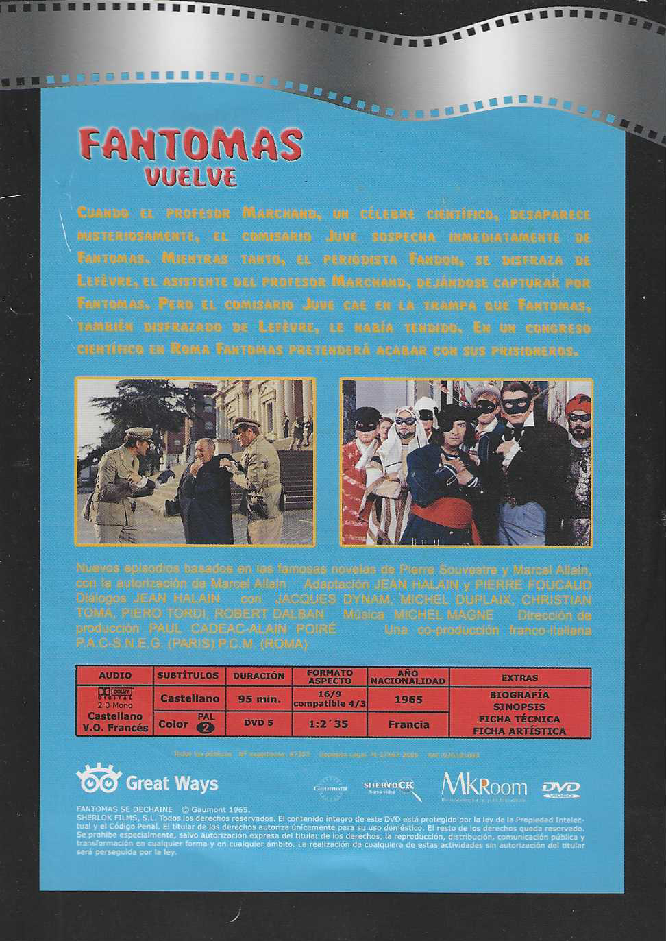 https://back.dvdstorespain.es/es/segunda-mano/129112-fantomas-vuelve-edicion-sobre-dvd-1965-fantomas-se-dechaine-segunda-mano--0634065166540.html129112Fantomas Vuelve (Edición sobre) [DVD] (1965) Fantômas se déchaîne [Segunda Mano]Cuando el profesor Marchand, un célebre científico, desaparece misteriosamente, el comisario Juve sospecha inmediatamente de Fantomas. Mientras tanto, el periodista Fandon se hace pasar por Lefèbvre, el ayudante de Marchand, y es capturado por Fantomas. Pero también Juve cae en la trampa que el criminal, disfrazado de Lefèvre, le ha tendido. Fantomas se propone acabar con sus prisioneros durante un congreso científico que se celebra en Roma.https://dvdstorespain.es/1125381-home_default/fantomas-vuelve-edicion-sobre-dvd-1965-fantomas-se-dechaine-segunda-mano-.jpg4.6281instock4.62814.6281002026-02-03T08:44:41+0100/Inicio/Inicio/DVD/Inicio/Películas/Inicio/Segunda Mano