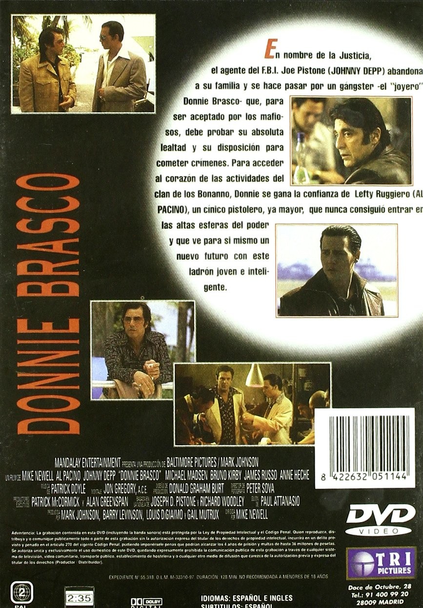 https://back.dvdstorespain.es/es/segunda-mano/130142-donnie-brasco-dvd-1997-segunda-mano-8422632051144.html130142Donnie Brasco [DVD] (1997) (Segunda Mano)El agente del FBI Joe Pistone debe abandonar temporalmente a su familia y hacerse pasar por un gángster: el joyero Donnie Brasco. Sin embargo, para ser aceptado por los mafiosos debe probar su lealtad y su capacidad para cometer crímenes. Su objetivo es investigar las actividades del clan de los Bonnano y, para ello, se gana la confianza de Lefty Ruggiero, un pistolero en decadencia que nunca consiguió acceder a las altas esferas del poder... Basada en una historia real.https://dvdstorespain.es/1144285-home_default/donnie-brasco-dvd-1997-segunda-mano.jpg5.2893instockTripictures5.28935.2893002026-03-05T22:24:42+0100/Inicio/Inicio/Películas/Inicio/Segunda Mano