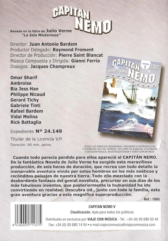 Capitan Nemo Episodio 5 [DVD] es la continuación de la emocionante serie animada basada en la novela clásica de Julio Verne. Esta entrega te sumerge en nuevas aventuras submarinas del mítico capitán y su tripulación a bordo del Nautilus. Disfruta de la animación de alta calidad y los impresionantes efectos visuales que recrean los misterios del océano. Con un argumento cautivador y personajes entrañables, este DVD de aproximadamente 90 minutos de duración (1 hora y 30 minutos) te mantendrá al borde de tu asiento. Revive la magia de las historias clásicas con Capitan Nemo Episodio 5, ideal para disfrutar en familia o con amigos amantes de la ficción de aventuras.