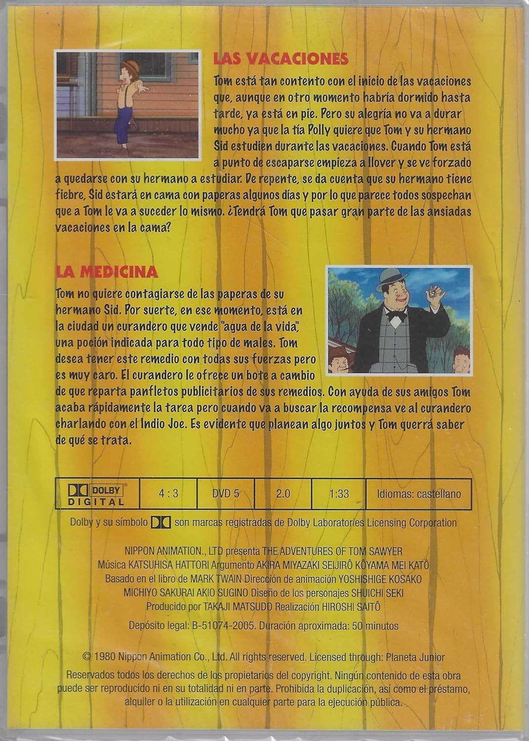 Disfruta de dos emocionantes episodios de Las Aventuras de Tom Sawyer en este DVD de Planeta D'Agostini. El volumen 11 incluye 'Las Vacaciones' y 'La Medicina', con una duración aproximada de 50 minutos. Basado en la obra clásica de Mark Twain, este DVD presenta las travesuras y aventuras del inolvidable Tom Sawyer, producido por el reconocido estudio Nippon Animation. Con una calidad de imagen 4:3 y sonido Dolby Digital 2.0, este DVD está completamente en castellano. La animación, dirigida por Yoshishige Kosako, cuenta con música de Katsuhisa Hattori y un diseño de personajes que captura perfectamente el espíritu de la historia original. Ideal para toda la familia, estas historias transportarán a los espectadores a las orillas del río Mississippi para vivir las aventuras de uno de los personajes más queridos de la literatura universal. Prohibida su reproducción pública o duplicación.