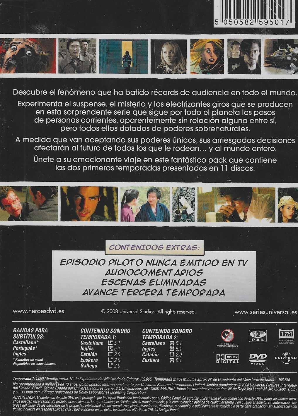 https://back.dvdstorespain.es/es/series-dvd-blu-ray/129952-heroes-temporadas-1-y-2-completas-dvd-dvd-2024--5050582595017.html129952Héroes (Temporadas 1 y 2 competas) [DVD] (2006) HeroesSerie de TV (2006-2010). 4 temporadas. 78 episodios. Algunas personas nacen para ser extraordinarias. Un grupo de personas normales se ve, de la noche a la mañana, dotada de increíbles poderes. Así, mientras en Japón un anónimo oficinista descubre que tiene un don para teletransportarse, en Nueva York un artista se da cuenta de que es capaz de pintar el futuro, o en Los Ángeles un policía puede escuchar los pensamientos ajenos. Estas personas no sólo tendrán que aprender a conocer sus poderes y a dominarlos, sino que además deberán decidir qué destino quieren darles.https://dvdstorespain.es/1140985-home_default/heroes-temporadas-1-y-2-completas-dvd-dvd-2024-.jpg32.3967instock32.396732.3967002026-03-01T03:45:13+0100/Inicio/Inicio/DVD/Inicio/Series de TV/Inicio/Nuevos