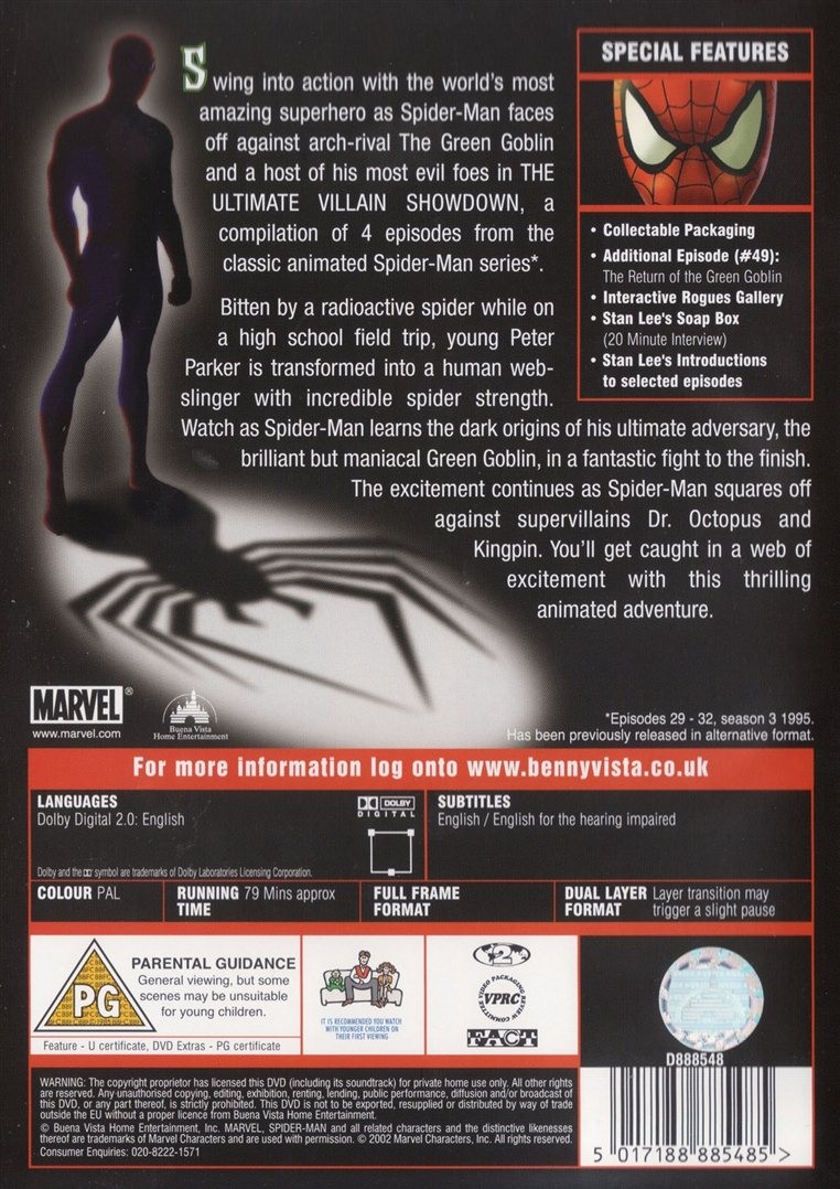 https://back.dvdstorespain.es/es/series-dvd-blu-ray/130641-spider-man-the-ultimate-villain-showdown-edizione-regno-unito-reino-unido-dvd-2002--5017188885485.html130641Spider-Man: The Ultimate Villain Showdown [UK] [DVD] (1994)Serie de TV (1994-1998). 5 temporadas. 65 episodios. Serie de animación emitida en los años 90 por la cadena FOX en EEUU y Antena 3 en España. Se centraba en la figura de Peter Parker (Spiderman) y sus enfrentamientos contra villanos como Veneno, Doctor Octopus, el vampiro Morbius, Camaleón, Shocker o Rhino, entre otros. A lo largo de la misma se dieron cita muchos cameos del universo Marvel, con capítulos con apariciones de los X-Men, Hulk, El Castigador, Daredevil, Blade, etcétera. En 2003, FOX realizó un remake, "Spider-Man: The New Animated Series", con animación 3D.https://dvdstorespain.es/1153046-home_default/spider-man-the-ultimate-villain-showdown-edizione-regno-unito-reino-unido-dvd-2002-.jpg8.2579instock8.25798.2579002026-03-20T01:45:27+0100/Inicio/Inicio/DVD/Inicio/Series de TV/Inicio/Nuevos